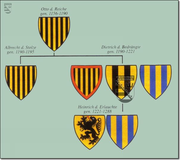 ten in einem Reitersiegel, das er bis um 1200 führte und in dem er als Markgraf von Meißen bezeichnet wird. Es zeigt sechs Pfähle, die von einer Schildbordüre umgeben werden. Der Schildrand gehört zu den ältesten bekannten Wappenminderungen für jüngere Zweige einer Familie und liegt in seiner Entstehung noch weiter zurück als Turnierkragen und ähnliches.